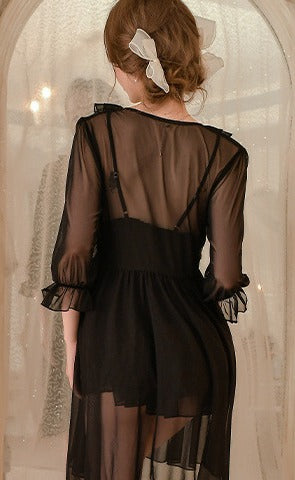 • Three-piece lingerie set: sheer babydoll, lace-trim robe, and coordinating panty